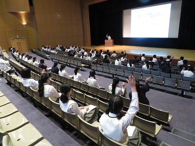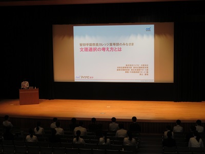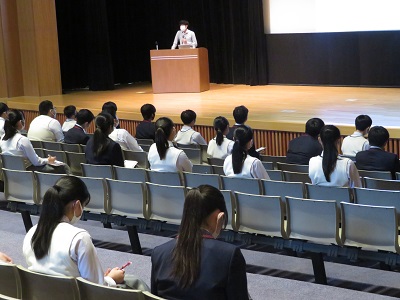 10月13日(水)にマイナビ 関西・四国進路サポート1課 課長の髙辻直哉 様を講師としてお招きし,高等部1年を対象として「文理選択の考え方とは」と題した進学講演会を開催しました。2年からの文理選択を控えた高等部1年は,進路の選択において重要な位置であるとした上で,髙辻様は,この選択が将来の自分自身の姿にもつながってゆくこと,それには情報収集がとても重要であることなどを熱く語ってくださいました。生徒たちはこれらの話を真剣に聞きながらメモをとっていました。