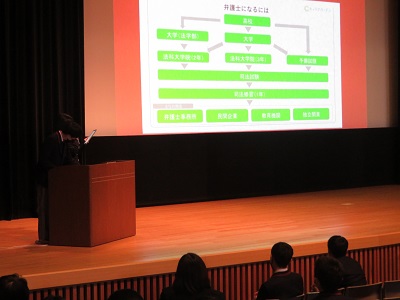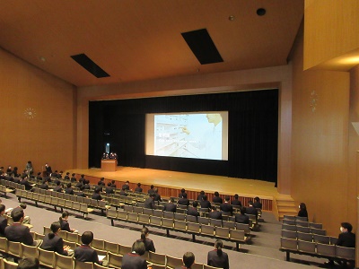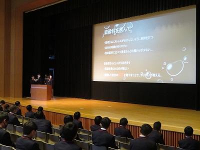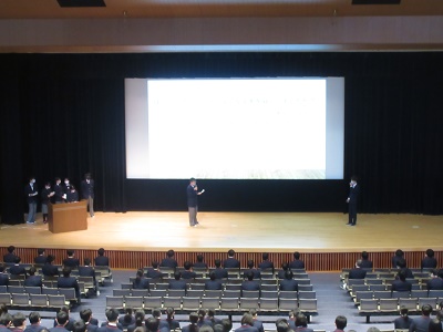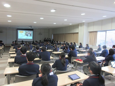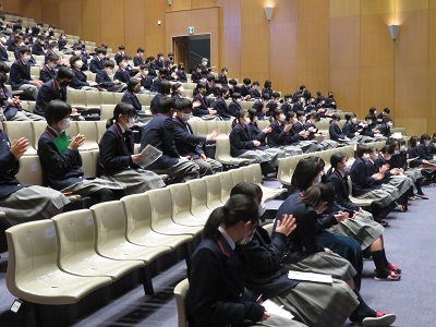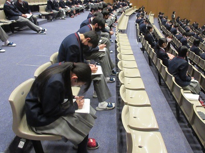 中学部3年では,キャリア教育の一環として,さまざまな職業の方々にインタビューを行い,調べたことをスライドにまとめてグループで発表します。事前に予選が行われ,選ばれた8グループが今回の講堂での発表大会に臨みました。なお、中学1・2年生もこの発表を見学し,各グループの発表についての感想を書き,質問もできるようになっていました。選ばれた作品だけに,どれもなかなかの力作揃いで,分かり易いスライドを用いたものや工夫を凝らした内容のものもあり,参加した生徒たちも熱心に見学していました。