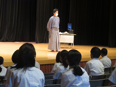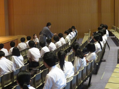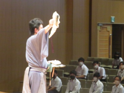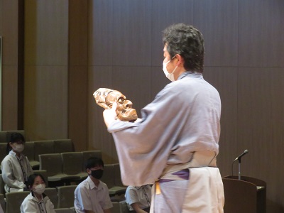 行事 高1 能楽鑑賞教室事前学習会 2022年6月8日 2022年6月8日 金春流能楽師の金春穂高先生をお招きした能楽鑑賞の事前学習会を、6月7日(火)に奈良カレッジ講堂において、今回は高等部1年生を対象として行いました。学習会では能楽の基本的知識、謡(うたい)の持つ意味をはじめ、実際に使われる能面の説明などがありました。高等部1年を対象とした『奈良春日野国際フォーラム甍』における能楽鑑賞教室は6月19日(日)を予定しています。