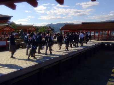 | 「はいポーズ!」(宮島へのフェリーにて) | 厳島神社参拝 |
