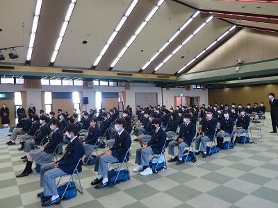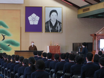錬成会は、相互礼拝・相互扶助の精神を学ぶとともに、日常の「甘えの生活」を反省し、人やあらゆるものに感謝する姿勢を育む目的で、高等部1年生を対象に辯天宗茨木本部において実施しています。例年錬成会は2泊3日の宿泊行事として行いますが、今年も昨年同様コロナウイルス感染拡大防止の観点から、一日行事として行いました。この日(11月10日)、午前中に教話が行われ、午後には般若心経をお唱えする行があり、生徒たちにとっては普段の学校生活とは大きく異なる一日となったことでしょう。
