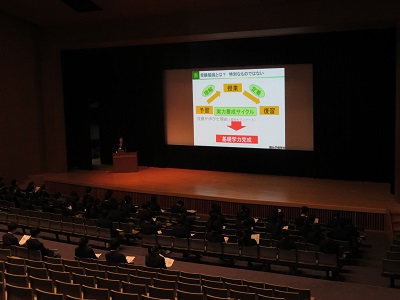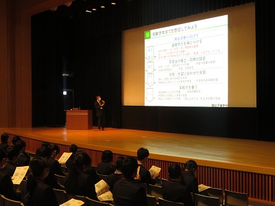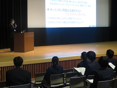 12月5日(月)に駿台予備学校から小倉雅宜先生を講師としてお招きし、「大学入試を取り巻く環境と現役合格へ向けた学習」と題して、高等部2年生およびその保護者を対象に進学講演会を開催しました。小倉先生は、大学進学や受験勉強に対する心構えについて、資料なども使用しながら約2時間にわたり熱心に語ってくださいました。生徒たちもこれからいよいよ受験生としてさらに勉強を本格化させていくことになります。