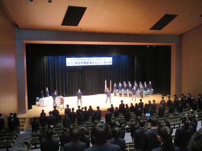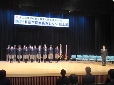 12月9日(金)駅伝全国大会に出場する奈良カレッジ陸上競技部の壮行会が講堂で行われました。今年も新型コロナウイルス感染拡大防止のため、高等部の生徒のみが直接参加し、中学部生徒は各教室からのリモート参加となりました。