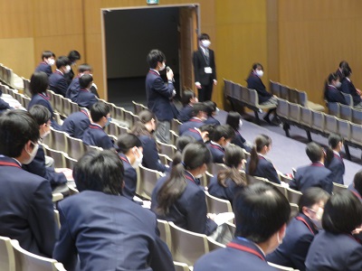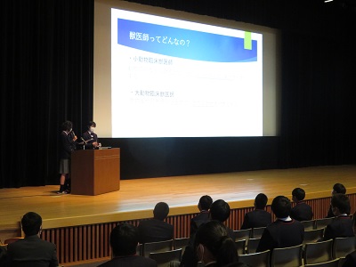 奈良カレッジでは、中学部3年生がキャリア教育の一環として、さまざまな職業の方々にインタビューを行い、調べたことをスライドにまとめてグループで発表します。先ずは学年全員の参加する予選が行われ、その中で選ばれた8グループが講堂での発表大会に臨みました。なお、中学1・2年生もこの発表を見学し、各グループの発表についての感想を書き、質問もできるようになっていました。選ばれた作品だけになかなかの力作揃いで、分かり易いスライドを用いたものや工夫を凝らした内容のものもあり、中1・2年生も近い将来自分もやることになるだろう発表だけに、熱心に見学していました。