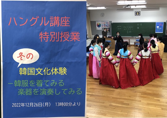 その他 ハングル講座 特別授業 2022年12月28日 奈良カレッジでは中学部3年生を対象にハングル講座を実施しています。昨年は行えなかった特別授業を、12月26日(月)に中3希望者を対象に行いました。今回は「冬の韓国文化体験-韓服を着てみる 楽器を演奏してみる」と題し、生徒たちは民族衣装を着て、楽器を演奏したり、踊ったりしました。...
