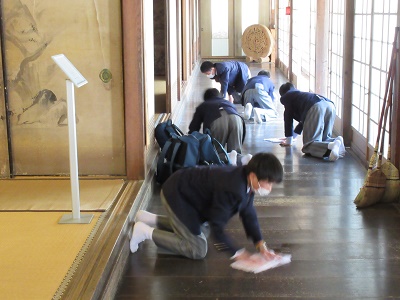 | 清掃活動も行います | 校長先生が激励に来てくれました |
