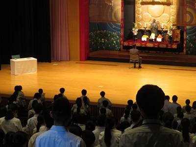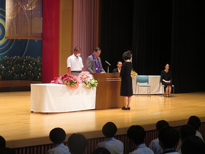 6月20日(火)、6月の感謝祭と永年勤続職員表彰式が行われました。智辯学園では6月12日が学園創立日です。6月の感謝祭では、理事長先生が創立記念日の経緯を紹介し、長年勤められた教職員を表彰することが習わしになっています。また、この月の感謝祭には中学1年生の保護者を招待し、感謝祭に参加していただく機会にもしています。昨年までは一部生徒がオンライン参加でしたが、今年は中学生と高校生の全員と中学1年生保護者が講堂に入場しました。