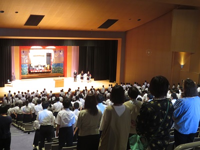 | 永年勤続者代表者謝辞 | 中1保護者を交えての全員での校歌斉唱 |