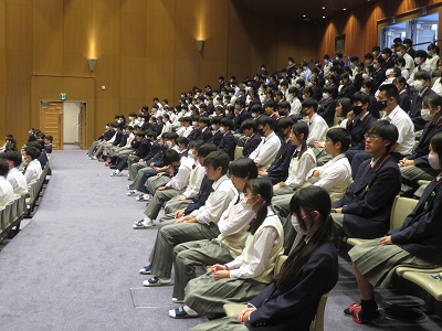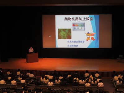 10月20日(金)、奈良県香芝市警察署生活安全課およびスクールサポーターの方による薬物に関する講演会と、奈良県警察音楽隊による演奏会を催しました。薬物乱用の恐ろしさについては、生徒たちも熱心に聞き入っていました。
