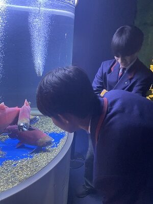 | 始まりはサケの遡上を体感できる千歳水族館から | サケの様子を観察する生徒 |