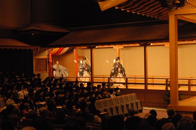 4月21日(日)、高等部1年生は、奈良春日野国際フォーラム 甍 の能楽ホールで行われた「奈良金春会演能会」を能楽鑑賞教室として見学しました。能・金春流「小袖曽我」、狂言・大蔵流「清水」、能・金春流「西行桜」を鑑賞し、舞や謡の様子、和楽器の演奏など、能の舞台がどのように進められるかを実際に体験しました。(写真は能楽協会の許可を得て撮影しています。無断転用を禁止いたします。)