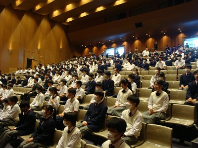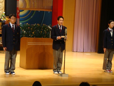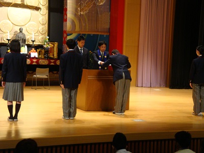 5月7日(火)、感謝祭および生徒会任命式が行われました。『般若心経』をお唱えした後、校長先生から生徒会役員の任命式が行われました。そして新しい生徒会役員を代表して生徒会長が挨拶し、今年の活動の抱負を表明しました。その後の感謝祭では、理事長先生が、今年は桜が遅くまで咲いて入学式を桜の中で行うことができたこと、また卒業生の合格体験の話を紹介する中で、感謝することの大切さや辯天宗のご宗祖さまのお言葉についてお話をしてくださり、生徒たちは神妙にその話に聞き入っていました。