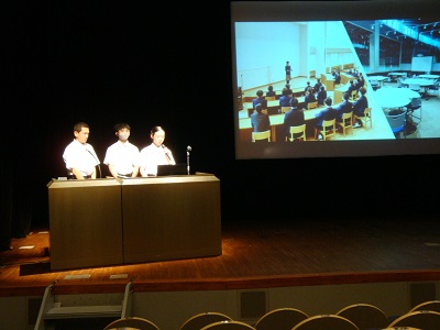 | 小ホールでの生徒会による学校紹介 | 学校紹介のポスター展示 |