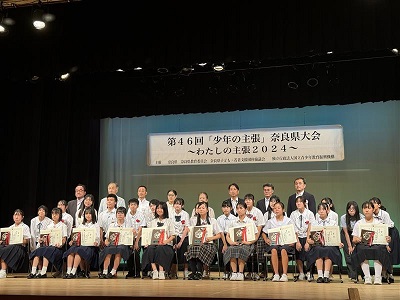 その他 第46回「少年の主張」奈良県大会 2024年9月17日 2024年9月17日 9月8日(日)、第46回「少年の主張」奈良県大会が葛城市當麻文化会館で開催されました。応募総数3,589作品の中から、中学部3年別所優薫さんの「今になって気づいたこと」が優良賞に選ばれました。当日の別所さんは、自分の主張がしっかりと伝わる堂々とした発表を行いました。おめでとうございます。