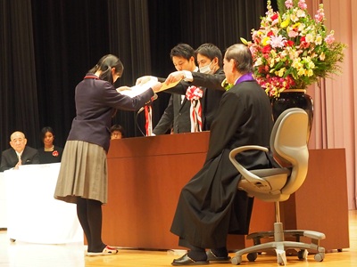 | 卒業証書を校長先生が一人ひとりに渡します | 理事長先生との握手を交わしながら行われました |