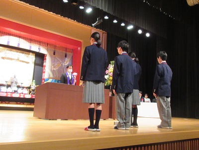 在校生代表(生徒会長)からもお祝いのことばがありました。 新入生代表宣誓