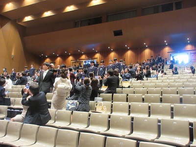式に備え、新入生が神妙な顔つきで先生の説明を聞いていました。 新入生の晴れやかな入場です。