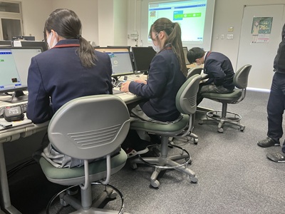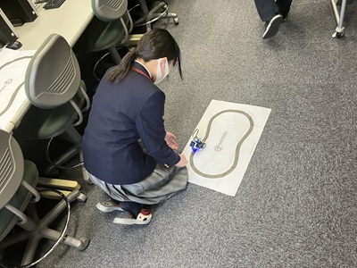 情報Ⅰの授業で、小型コンピュータボードのマイクロビットを使って、プログラミングを行いながら、音楽を奏でたり、ロボカーを自動操作しながら衝突回避したり、ライン上を走行させたりしました。