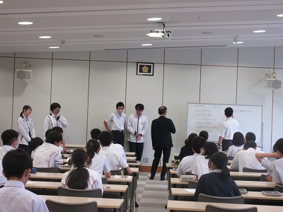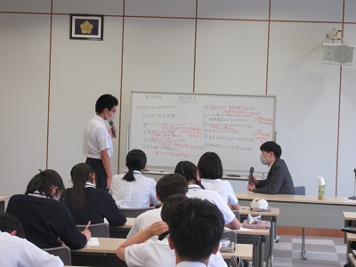 まず、講師先生がインタビューの基本と心得を分かり易くお話しくださいました。その後、担任の先生にインタビューをするならという設定で、質問項目をみんなで出し合い、実際に代表生徒がインタビューを行いました。講演は大変興味深いもので、これからインタビューを行う生徒たちはノウハウを身につけようと、熱心に取り組んでいました。