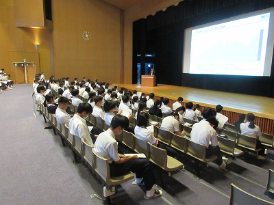 7月5日(土)に駿台予備学校 中高営業部課長 上岡 晃久(かみおか あきひさ) 先生を講師としてお招きし、「大学入試の現状と現役合格に向けての心構え」と題し、高等部2年生およびその保護者を対象に進学講演会を開催しました。この講演会では、1.新課程入試の実施を受けて(昨年の大学入試共通テストを分析して)、2.受験勉強への向かい方、3.受験生の保護者の心構え、の3点を中心に、資料を使用しながら1時間にわたりお話しいただきました。高等部2年生もいよいよ勉強を本格化させていくことになります。