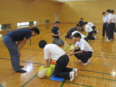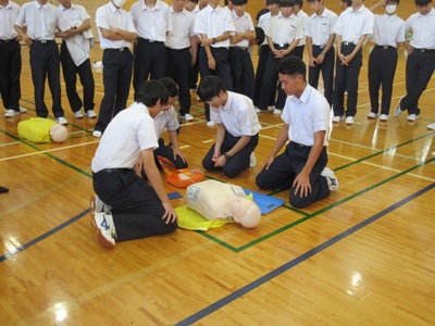 その他 高2 救急救命対応講習会 2025年9月12日 2025年9月12日 9月12日(金)、高等部2年生男子の保健体育の授業として、胸骨圧迫とAEDの使用方法についての講習会を開きました。この講習会は香芝消防署のご協力の下、「もしこんなことが起こったら・・」という事態に備えて、より実践的な講習を行っていただきました。生徒たちも万一に備え、真剣な面持ちで講習会に臨んでいました。 胸骨圧迫の実践練習 AEDの使用方法を体験