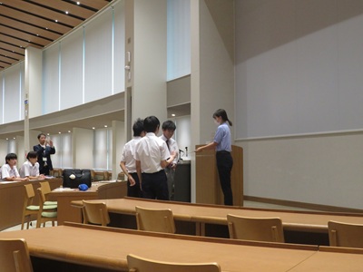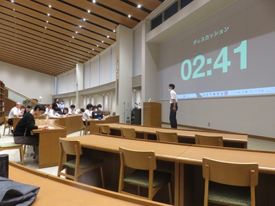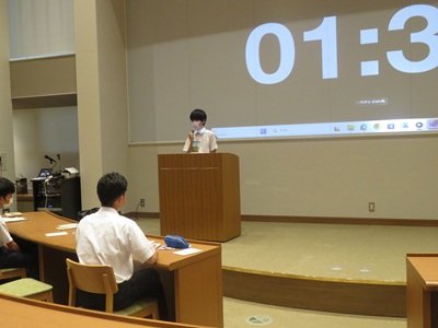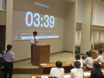 10月10日(金)の放課後、図書館のプレゼンテーションエリアにおいて、ビブリオバトル校内予選が行われました。高1・高2の生徒を対象に募集し、今年は4名が応募してくれました。各人はそれぞれ5分間で紹介したい本について語り、引き続いて、3分間の質疑に対して応答しました。代表に選ばれた生徒は後日行われる奈良県大会に出場します。