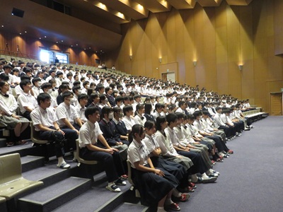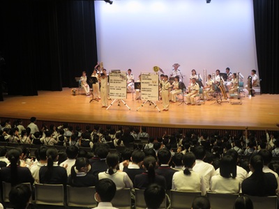 10月14日(火)、香芝警察署生活安全課の方による薬物に関する講演会と、奈良県警察音楽隊による演奏会を催しました。講演会では、忍び寄る薬物の恐ろしさについて、生徒たちは熱心に耳を傾けていました。一方、演奏会では、警察音楽隊の演奏やカラード隊の振り付けに加え、本校吹奏楽部との合同演奏もあり、会場は大いに盛り上がっていました。
