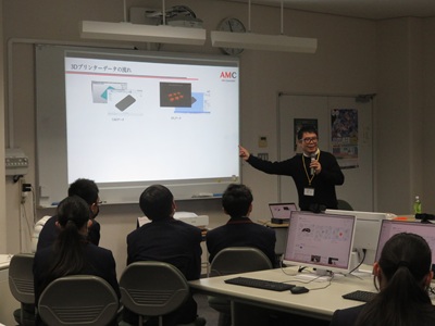 11月15日(土)の放課後に、AMコンサルタントの山田晃裕(やまだ あきひろ)先生を講師としてお招きし、美術部とPCロボット部の生徒をはじめ、希望者を募り応募した生徒を対象として、第1回の3Dプリンター講習会を開催しました。なお、3Dプリンターおよび操作するコンピュータのセットアップは、山田先生のご指導の下、講習会に先立って行われました。この講習会では、前半は3Dプリンターの概要をお話くださり、後半はAutodesk Fusionを用いた3Dモデリングを実習形式で行われました。山田先生が熱心にご指導くださったこともあり、生徒たちはこれまでなかった新しい技術に楽しく取り組んでいました。