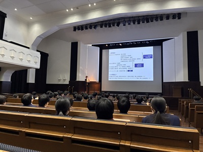 | 大阪大学キャリアセンター 副センター長の家島明彦先生による講演 演題は「高校生のためのキャリア教育講演ー人生100年時代のキャリアデザインー」 |