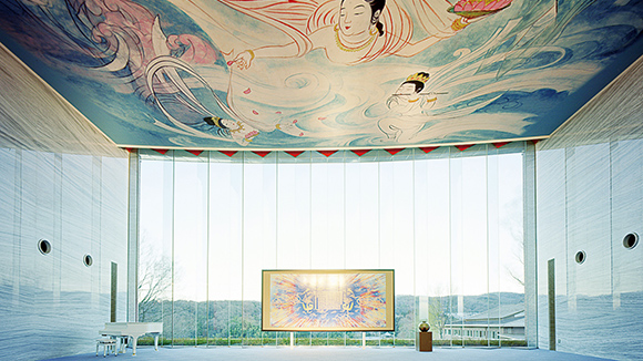 上には天女が飛び、正面には陶板に般若心経が描かれている。生徒たちは毎朝それに向かってお唱えをし、前を通る時には合掌をする。