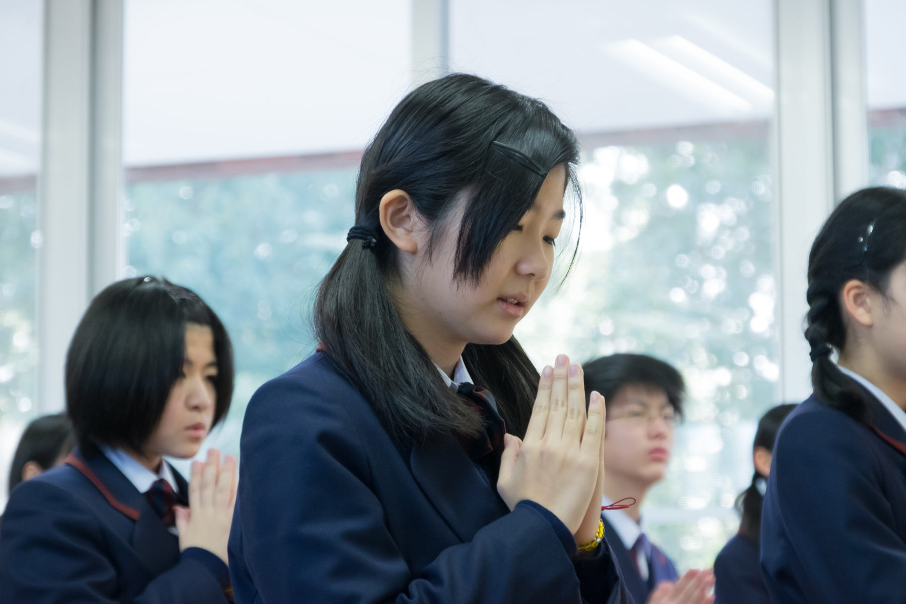 月に1度「感謝祭」があります。四恩(父母の恩、衆生の恩、天地の恩、三宝の恩)に感謝を捧げ、今後の努力と精進を誓います。そして、週に1度「宗教」の授業があります。この授業を通して、人や自然に対する優しさを学び、感謝と奉仕の精神を育みます。高校段階では倫理観や人生観に関わる学習へと発展します。また、毎朝「御真言・御宝号」をお唱えし、決意新たに1日の活動を始めます。あらゆる機会を通じて、「情感をはぐくむ教育」を行い、感謝と奉仕のできる人間に成長できるように努めます。