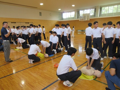 その他 高2 救急救命対応講習会 2025年9月12日 9月12日(金)、高等部2年生男子の保健体育の授業として、胸骨圧迫とAEDの使用方法についての講習会を開きました。この講習会は香芝消防署のご協力の下、「もしこんなことが起こったら・・」という事態に備えて、より実践的な講習を行っていただきました。生徒たちも万一に備え、真剣な面持ちで講習会に臨んでいました。 胸骨圧迫の実践...