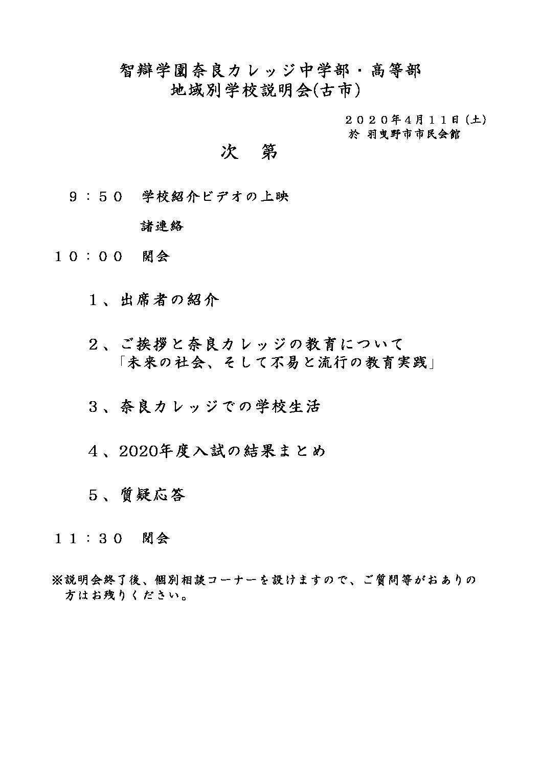 学園建学の理念(理事長)、中学・高等部の教育実践(校長)、令和8年度中学部・高等部入試の生徒募集と入試についてお話しします。また当日は、昨年度の中学入試プレテストと本番入試の問題と解答例を配布します。当日は、関屋駅・上ノ太子駅・高井田駅からスクールバスを運行します。お車でお越しいただいても結構です。