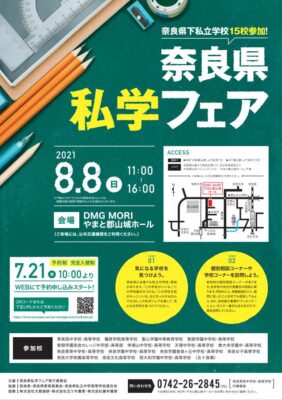 令和3年8月8日(日),やまと郡山城ホールにおいて「奈良県私学フェア2021」が開催されます。奈良県内の私立中学・高等学校の15校が参加し,各校の学校紹介やブース相談会などを行います。今年は,新型コロナウイルス感染拡大防止の観点から予約制・完全入替制といたしました。