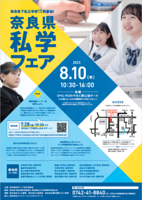 令和5年8月10日(木)、やまと郡山城ホールにおいて「奈良県私学フェア2023」が開催されます。本校をはじめ、奈良県内の私立中学・高等学校の15校が参加し、各校が学校紹介やブース相談会などを行います。奈良県私学にご関心のある方は是非お越しください。