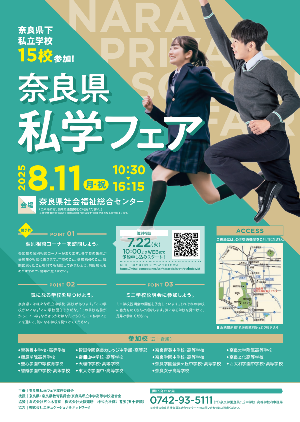 令和7年8月11日(月・祝)、奈良県社会福祉総合センターにおいて「奈良県私学フェア2025」が開催されます。本校をはじめ、奈良県内の私立中学・高等学校の15校が参加し、各校がミニ学校説明会や個別相談を行います。奈良県私学にご関心のある方は是非お越しください。個別相談の予約は7/22(火)10:00から開始します。