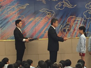 集会の前に、新児童会執行部の委嘱を行い、新しい執行部が決定しました。