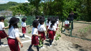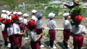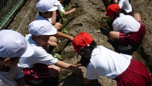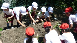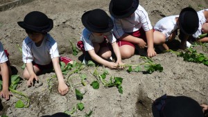 その他 1年生 さつまいも植え 2016年5月13日 2016年5月13日 5月13日、1年生のさつまいも植えを行いました。 畑で土に触れ、自然を感じるよい体験になりました。 秋の収穫を楽しみに、しっかりお世話をしたいと思います。 駐車場の奥に農園があります。 まずは苗について学習します。 みんな一所懸命に土を掘って、苗を植えました。おいしいさつまいもができますように。