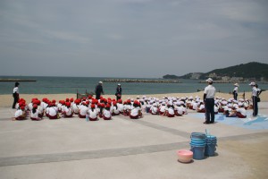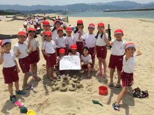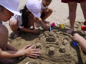 砂浜で砂のアートを協力して作り、交流を深めるのが目的です。何を作るのか、道具は何が必要なのか、役割はどうするのか…事前に2年生と5年生が話し合い、準備を進めてきました。当日も各班で協力して、素敵な砂のアートを作ることができました。その後、公園で班ごとに昼食を食べ、楽しく遊びました。