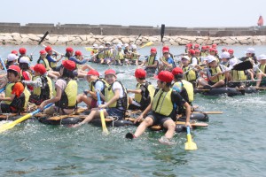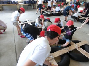 | いかだ作り。しっかり説明を聞いて自分たちで組み上げます。 | |