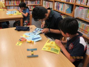 | ペーパークラフトで人工衛星を作ります。みんな真剣! | |