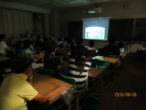 | 人工芝で星空観察。夏の大三角が見えました。 | 教室で月についてのビデオ鑑賞をしました。 |