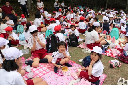 昼食前には、「せんせい、おなかすいた~。」と腹ぺこだった子も、愛情いっぱいのお弁当を開けた時は、きらきらに輝いた満面の笑みでした。屋外でレジャーシートを広げて、みんなで食べるお弁当は格別だったようで、話に花を咲かせながら終始笑顔で食べていました。
