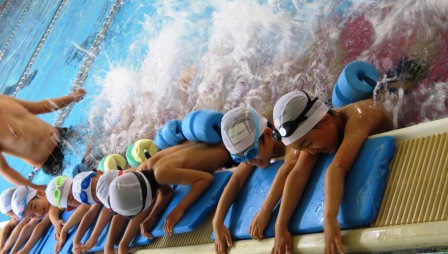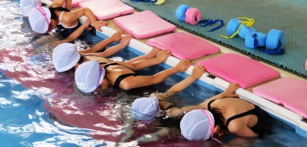 本校では、まことスイミングスクールにて指導を受けます。1年生の最初は、顔付けからです。「う~~、ぱっ」と上手に水中から顔を上げられました。そこから、バタ足・けのびの練習と続きました。「つま先を伸ばす!」などポイントをよく聞きながら、楽しみました。この日の最後は、水泳の基本姿勢の練習です。身体をぴんと伸ばして泳げたので、インストラクターに褒めてもらい、にこにこ喜んでいました。2年生、3年生では、背浮きやクロールの指導も受けます。これからの水泳の授業も楽しみですね。