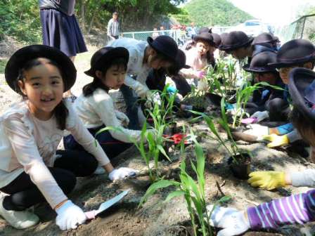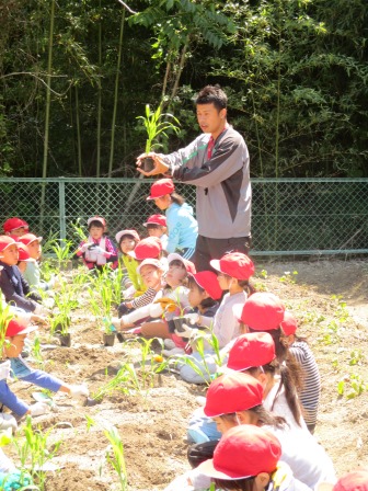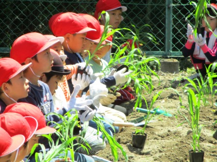 2年生が小学校の畑にとうもろこしの苗植えを行いました。汗ばむ陽気の中、子どもたちは、土の感触を楽しみながら穴を掘り「大きくなーれ」と声をかけながら、両手で優しく苗を植えました。今回の苗植えで、植物の生長に興味を持ち、水やりや草引きなどのお仕事も楽しみにしていました。