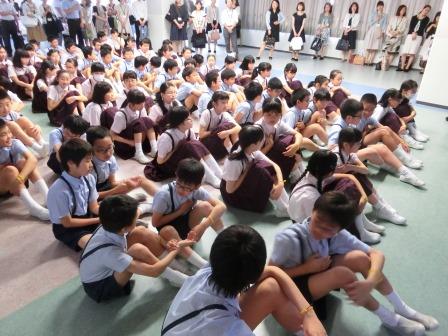 授業は、「隣にいる人と手をつなぎましょう」という先生の声かけから始まりました。突然のことで、保護者や子どもたちは、まだ戸惑いや恥ずかしさがあったようです。