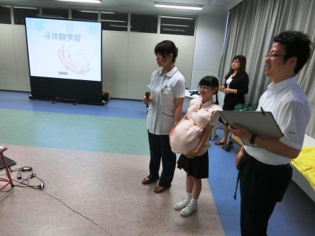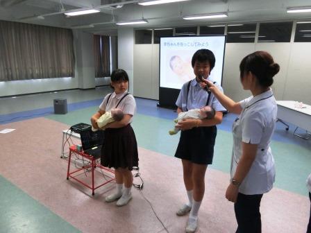 次に、病院で出産しているシーンをDVDで視聴し、体験学習をしました。児童の顔つきは真剣そのものです。保護者の方々は当時のことを思い出したのか、ハンカチで涙を拭いながらご覧になっていました。