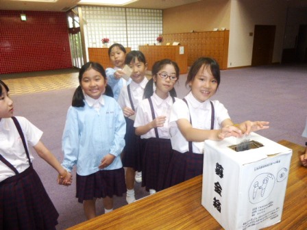 募金活動の日、児童会の子どもたちはエントランスから学校中に届く声で「ご協力をお願いします」と呼びかけると、多くの児童が寄付金を持って集まってきました。主体的に、誰かの幸せを願って活動する児童たちは、喜びと充実感に満ちた表情で、きらきらと輝いていました。