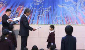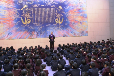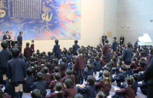 次に、先日の文化祭についてのお話で、子どもたちの頑張りを高く評価されました。最後の演目で、智辯学園和歌山校の開校40周年を祝して全児童で合唱した「未来へ」を聞いたときには、40年前の開校当初のことを思い出して感涙したと話しておられました。子どもたちは、自分たちの頑張りを褒めてもらい、うれしそうにお話を聞いていました。