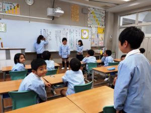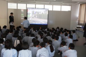 徒歩・車組は、アリーナⅡで2つの動画を見ました。いずれもクイズ形式で学習を進めたため、子どもたちは積極的に発表をし、興味を持って交通安全についての理解を深めることができたと思います。